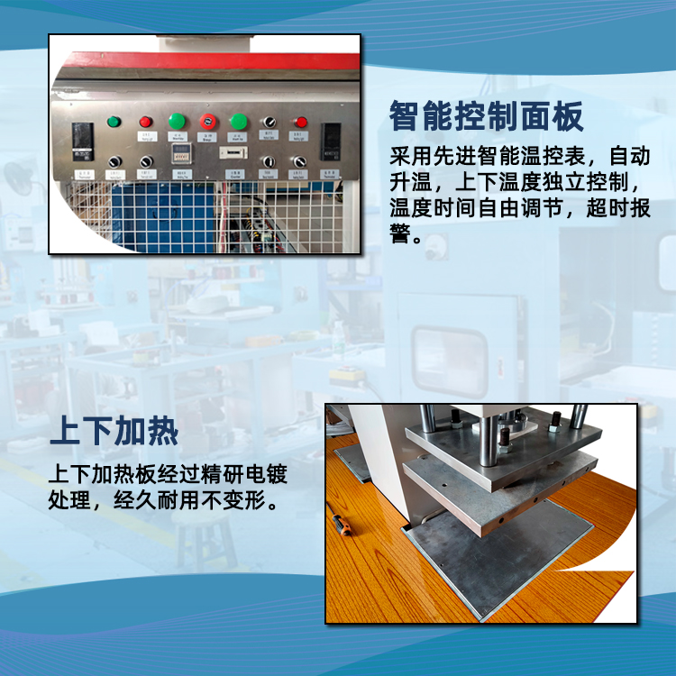 6、上下模具獨立加溫功能,自動恒溫,溫度誤差正負(fù)1度(采用平板式安裝模具方式,模具只需要安裝固定在平板上即可,簡單方便)