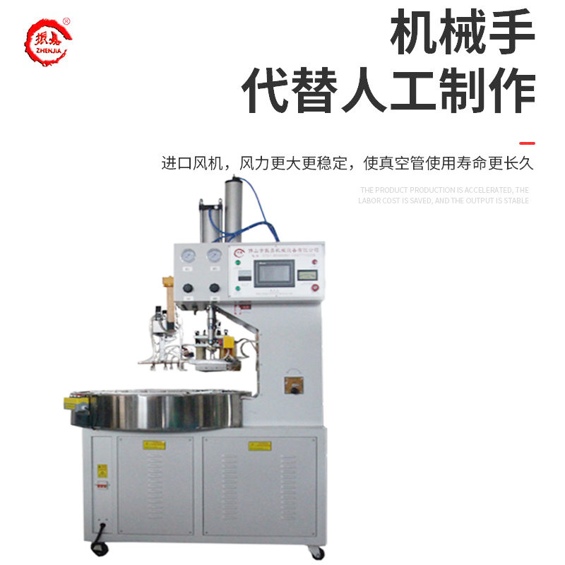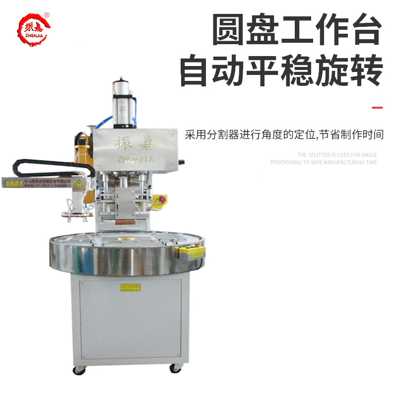1.全自動圓盤高周波機結(jié)構(gòu)設(shè)計為圓盤式結(jié)構(gòu),可以只需一個一操作,當一個工位人工取下產(chǎn)品并放置原料時,另一個工位剛好焊接完成,如此旋轉(zhuǎn)進出一個循環(huán)操作,只需放料,取料由機械手完成,使人工與機器做到合理運用,要省人力。