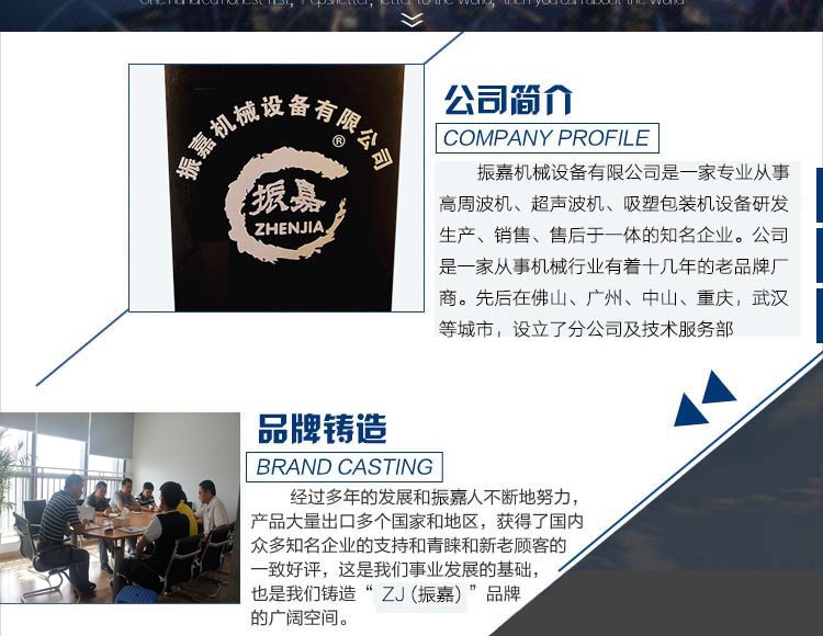 振嘉機(jī)械設(shè)備有限公司是一家專業(yè)從事吸塑包裝機(jī)、高周波機(jī)、超聲波機(jī)、設(shè)備研發(fā)、制造、銷售、售后于一體的知名企業(yè)。公司是一家從事機(jī)械行業(yè)有著十幾年的老品牌廠商,產(chǎn)品遠(yuǎn)銷東南來、中東歐美國家及地區(qū)。先后在中國佛山、廣州、中山、重慶、武漢等城市,設(shè)產(chǎn)了分公司及技術(shù)服務(wù)部,配套設(shè)有產(chǎn)品展示廳,技術(shù)工程師等以滿足用戶這售前、售后服務(wù)。